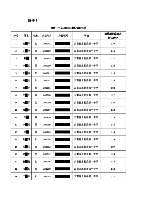 向日葵助学金永胜县第一中学 25 级向日葵公益高中班名单公示